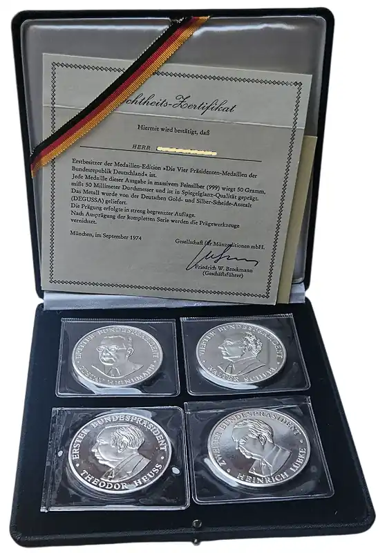 Silbermedaillen Die Vier Präsidenten – Spiegelglanz im Etui mit Zertifikat