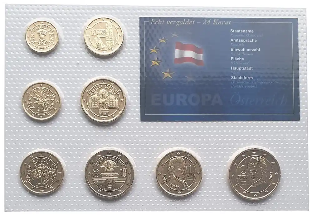 Österreich Kursmünzensatz 3,88 Euro 2002 vergoldet in Noppenfolie Neue Kollektion