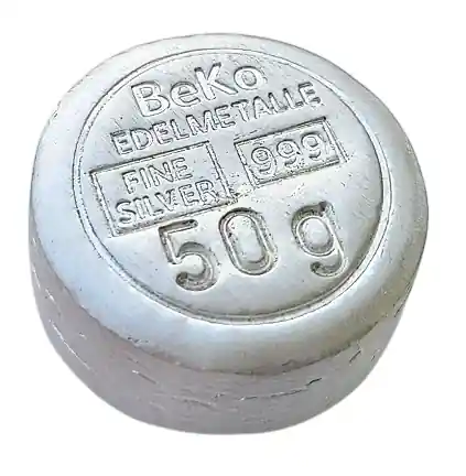Preisreduziert BeKo Edelmetalle 50 Gramm Rundbarren - (BeKo Button) 999 Feinsilber (gegossen) Sammlerbarren