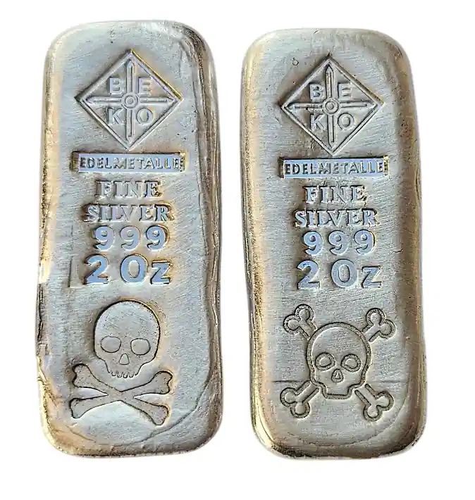 Start » Silberbarren » Rabatt BeKo Edelmetalle 2 x 2 Oz Silberbarren 999 Feinsilber (gegossen) Totenköpfe 01/99