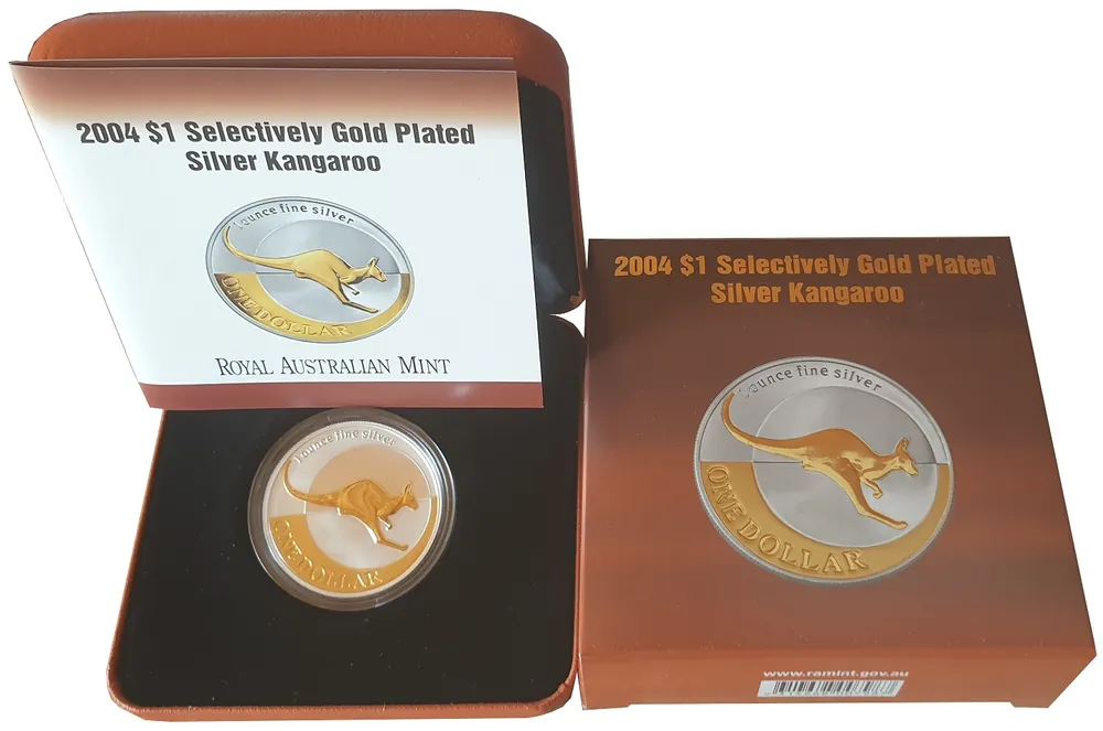 Sale 1 Oz Silber Känguru 2004 im Etui – Stgl vergoldet (Gilded) aus Australien