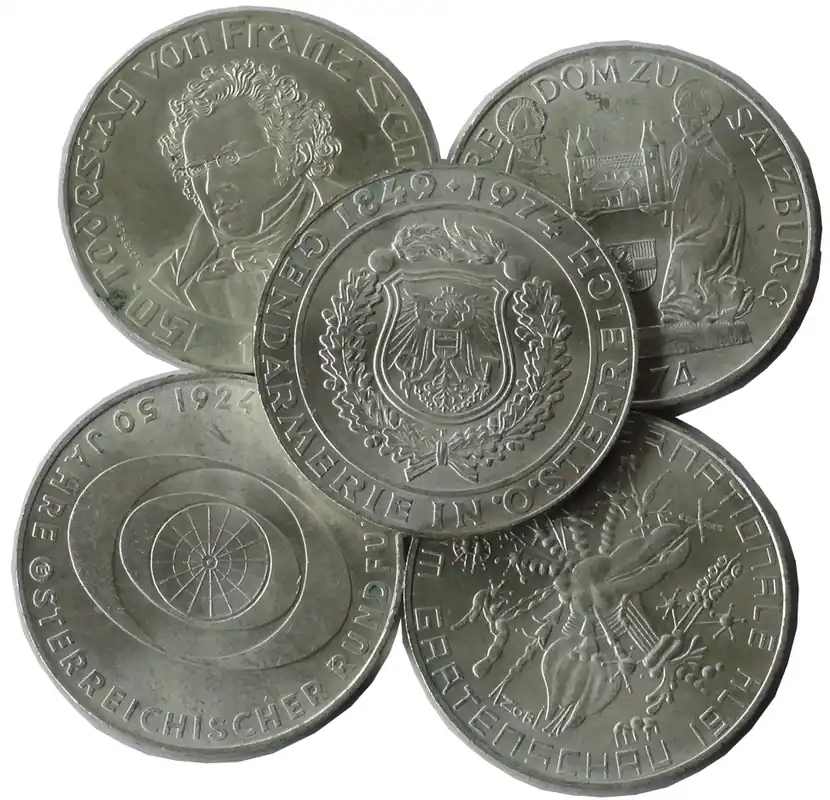 Start » Silbermünzen » Schneller Versand Österreich 50 Schilling Silbermünze Stempelglanz 1974 bis 1978