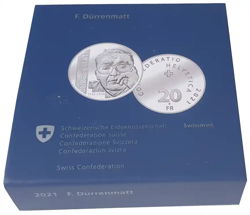 Schweiz 20 Franken Silber Friedrich Dürrenmatt 2021 Polierte Platte Künstlerzertifikat