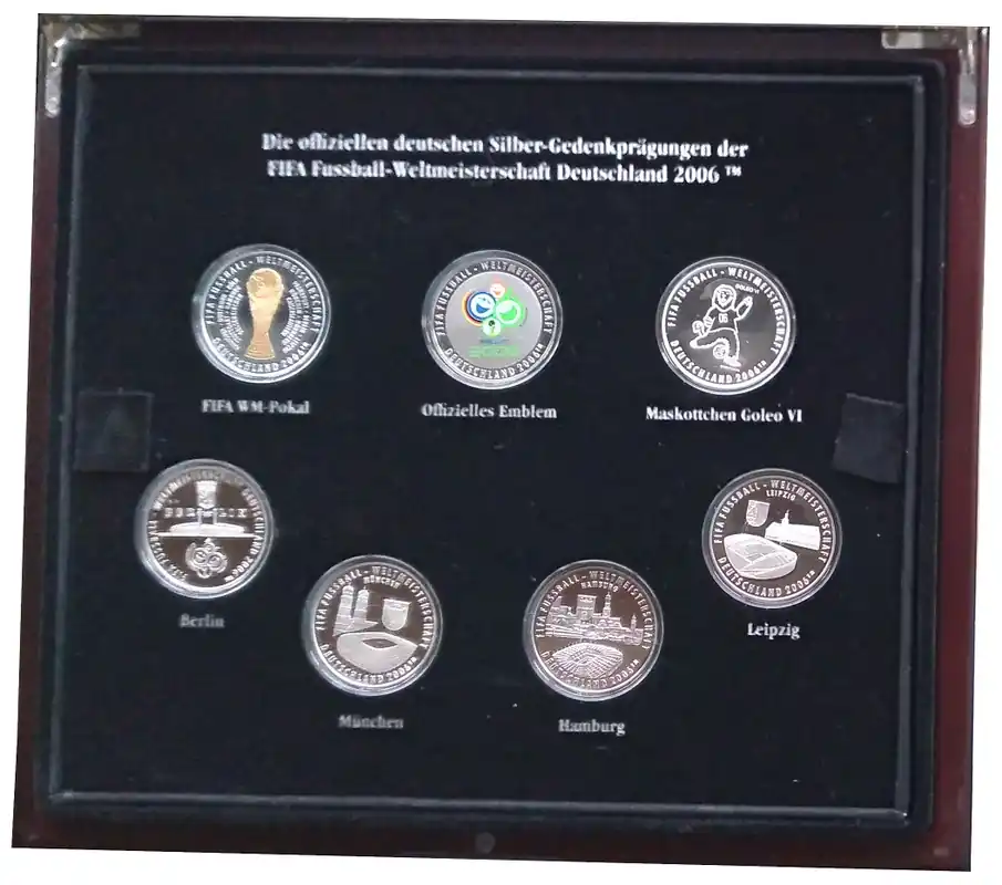 Münzkassette mit 15 Silbermedaillen – Fussball Fifa WM 2006. Insgesamt 375 gr 925/1000 Silber