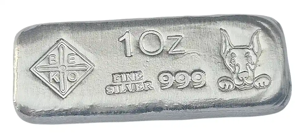 Start » Silberbarren » Top-Qualität BeKo Edelmetalle 1 Oz Silberbarren 999 Feinsilber (gegossen) 2026 Motiv Dobermann