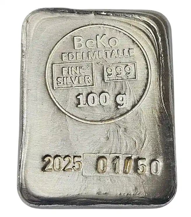Top-Seller BeKo Edelmetalle 100 Gramm Silberbarren 999er Silber (gegossen) 2025 Seriennummer 01/50