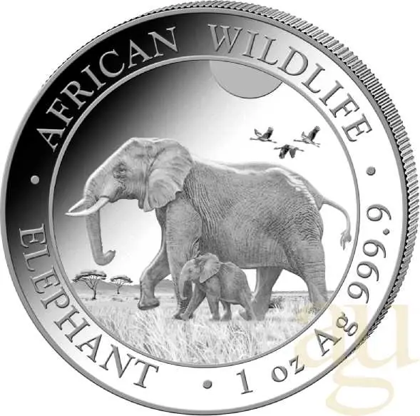Herkunftsland:SomaliaHersteller:verschiedeneSerie:Somalia ElefantStückelung:1 UnzeFeingewicht:31,1 GrammFeinheit:999.9/1.000, 999/1.000Nennwert:100 ShillingPrägejahr:2022Durchmesser:39,00 mmErhaltung:prägefrisch / NeuwareVerpackung:MünztascheGroßverpackung:500 pro Masterbox, 20 pro Tube