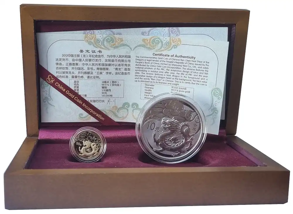 Versand Am Gleichen Tag China Gold – Silber Set 60 Yuan Drache 2012 Polierte Platte im Etui