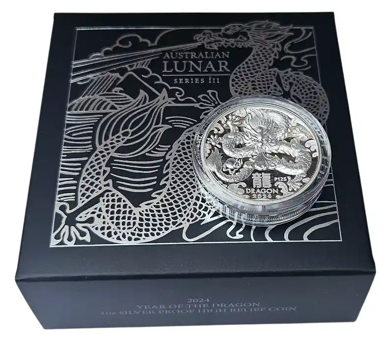 Start » Silbermünzen » Zertifiziert Australien 1 Oz Silber Lunar Drache III 2024 PP High Relief im Etui